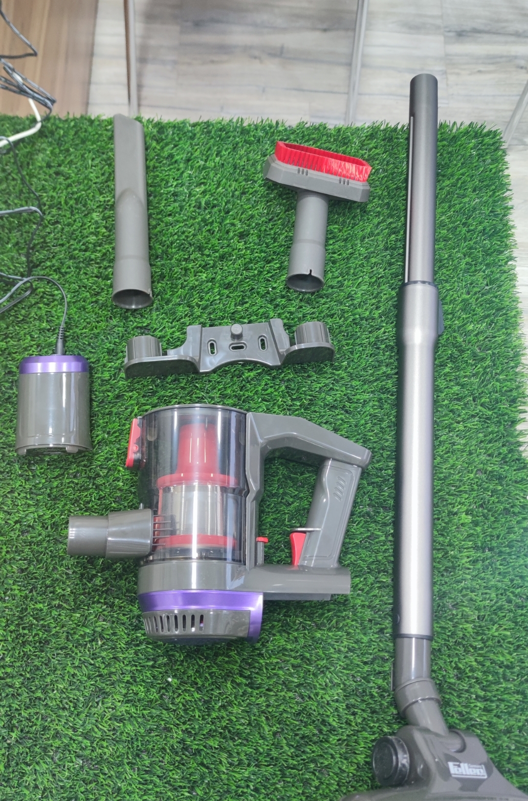 آداپتور شارژ باتری،استند نگهدارنده جارو روی دیوار ،و ۲عدد برس